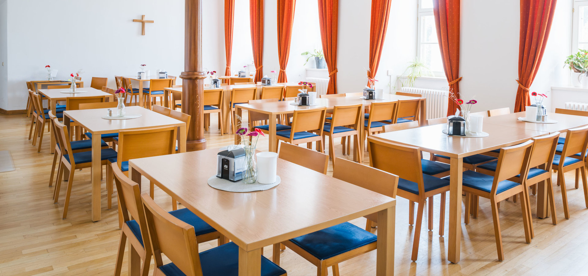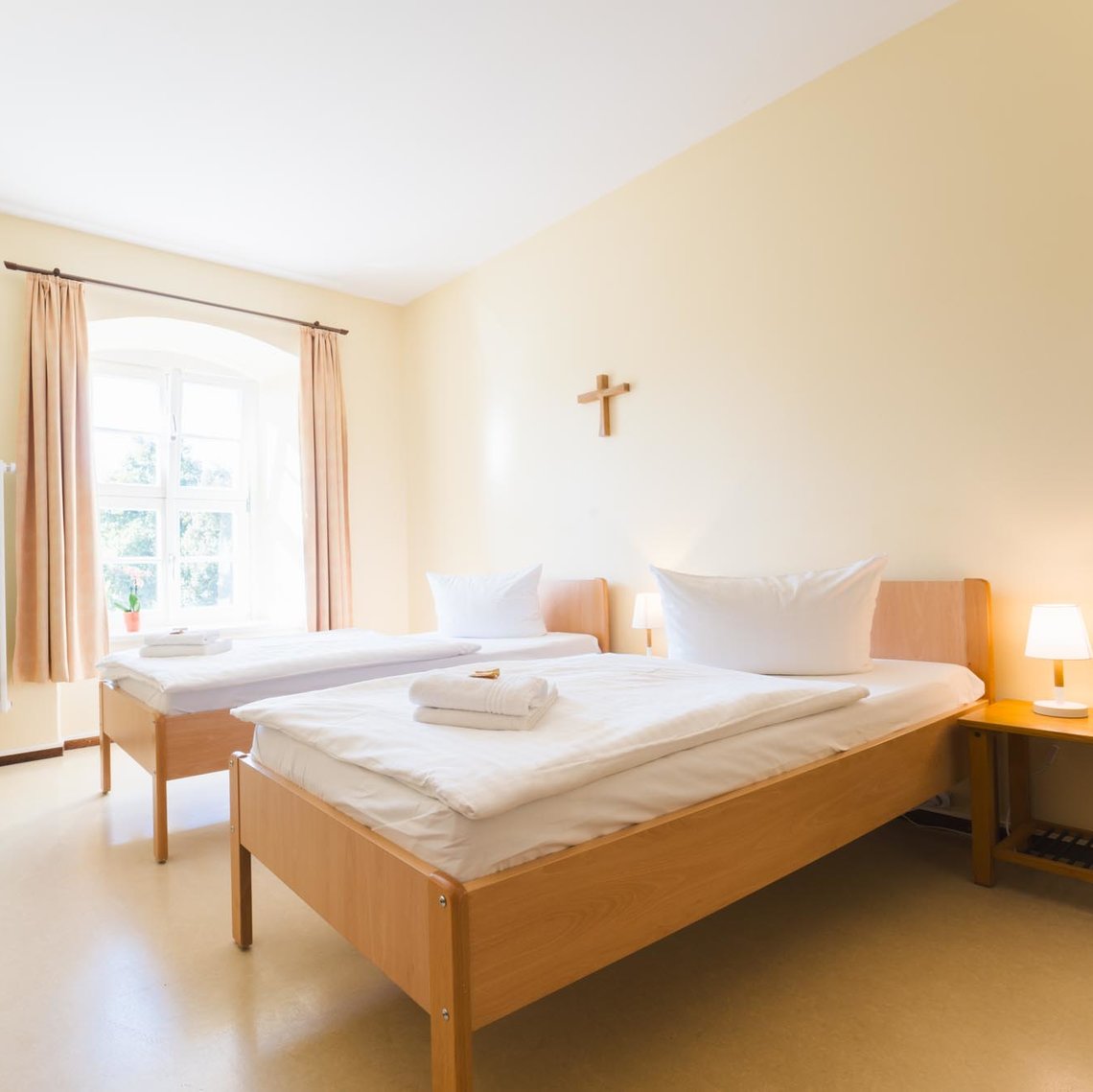 Unsere Zweibettzimmer im klassischen Stil bieten eine meditative, ruhige Atmosphäre. Zwei Einzelbetten sorgen für komfortablen Schlaf, helle Farbtöne lassen den Raum freundlich und leicht wirken. Rote Vorhänge und ein gemütliches Sofa setzen warme Akzente. Ein Schreibtisch mit Stuhl und ein kleines Bücherregal bieten Platz zum Lesen, Schreiben oder einfach zum Nachdenken.